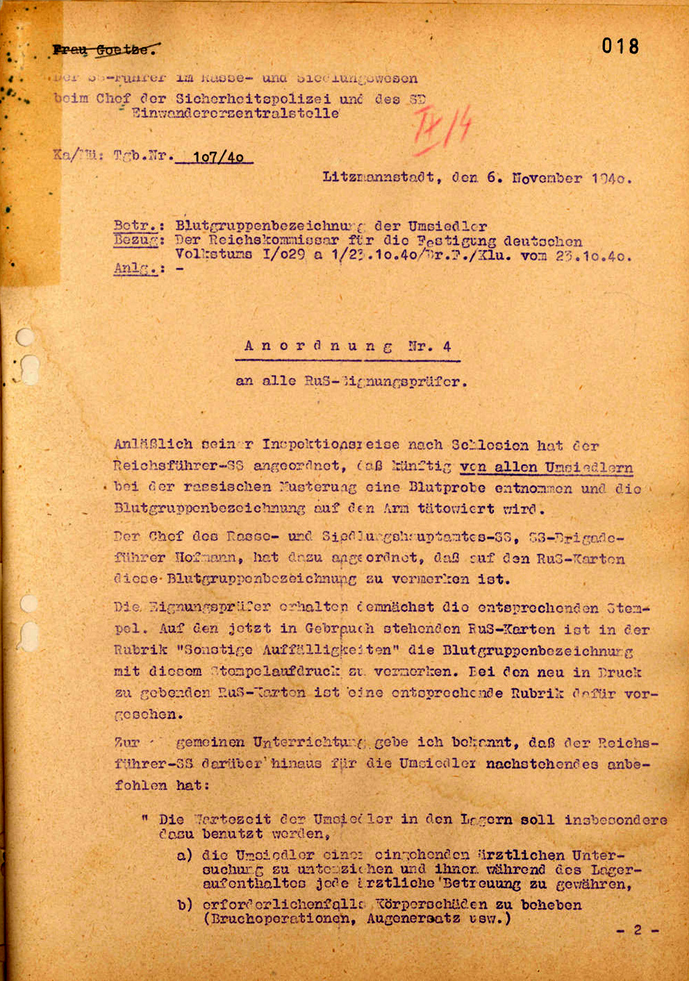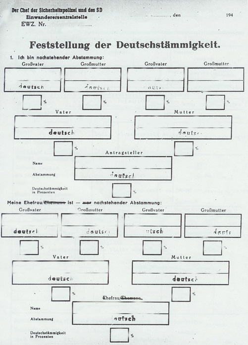 Auf Anordnung HImmlers vom wurde von jeder Person, auch den Kindern, die Blutgruppe bestimmt, registriert und im Arm eintätowiert . Dies führte nach Kriegsende zum Verdacht der SS-Zugehörigkeit bei den männlichen Umsiedlern, obwohl durchaus einige von ihnen freiwillig eintraten.